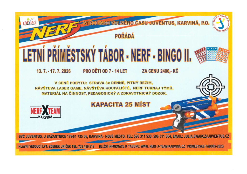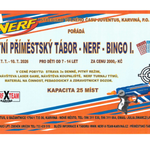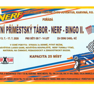 07.07.2026 Čtyřdenní příměstký tábor zaměřený na nerf. Děti pojedou na laser game do Ostravy, navštíví koupaliště a zahrají si i turnaj v nerf. Bližší informace k tomuto LPT NERF Bingo I., najdete zde.