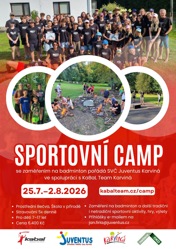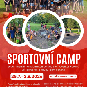 25.07.2026 Sportovně zaměřený pobytový tábor, zaměřený na badminton. Různorodé sportovní aktivity, tvoření, hry, výlety a další běžné i netradiční táborové aktivity.
