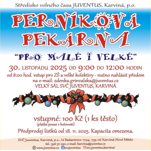 30.11.2025 Perníková pekárna opět provoní Juventus! Středisko volného času Juventus Karviná srdečně zve všechny milovníky vánoční atmosféry na tradiční akci „Perníková pekárna“, která se uskuteční v neděli 30. listopadu 2025 od 9:00 do 12:00 hodin. Těšit se můžete na dopoledne plné tvoření, vůně medu a sk...